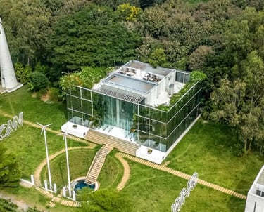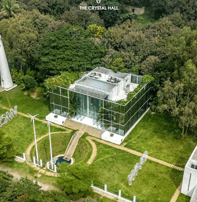 There’s something magical about the idea of sleeping under the stars and dining by moonlight. Yet, there's a unique comfort in enjoying all of this in a cool, air-conditioned space, with soft music, and away from the elements. The Crystal Hall in Bangalore offers the best of both worlds. Made entirely of glass, this property feels like stepping into another world, blending elegance with nature. It’s crafted around the five elements—earth, wind, fire, water, and space—represented beautifully through design: a lush lawn, wind-powered mills, a fire bowl, serene waterfalls, and a centrepiece called the Stele of the Soul.